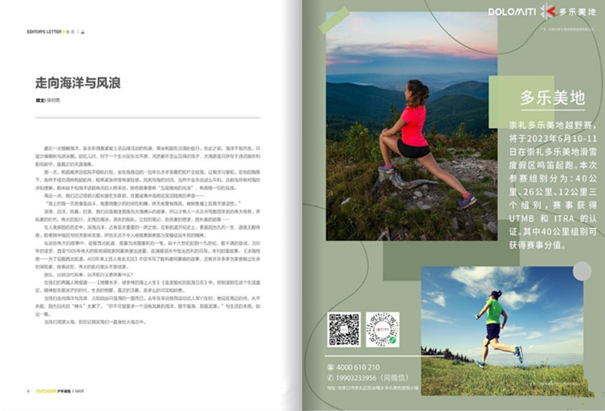 《運動休閑·戶外探險》(月刊)宗旨:健康的生活方式、實用的旅行線路、新鮮的戶外玩法、全面的裝備知識。她一向堅持“戶外是一種生活方式,探險是一種生活態度”,戶外不應該只是現實生活的補充,而應該是水乳交融的一種心態。